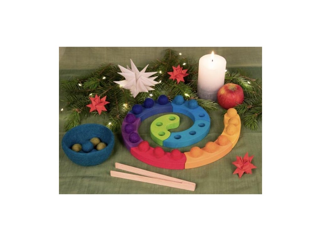Farebná špirála sa dá použiť aj ako adventná špirála. Adventná špirála je druh adventného kalendára – reflexívny rituál pre celú rodinu. Sprevádza deti adventom a spôsobom vhodným pre deti ilustruje, koľko dní zostáva do Štedrého dňa. Dvadsaťštyri vlnených plstených guľôčok sa deň po dni umiestňuje do priehradiek. Tento rituál sa dá skvele kombinovať s vianočným príbehom alebo spoločným spevom. Okrem týchto dvoch variácií ponúka jedinečný dizajn oveľa viac možností na voľnú hru, ktoré len čakajú na objavenie.