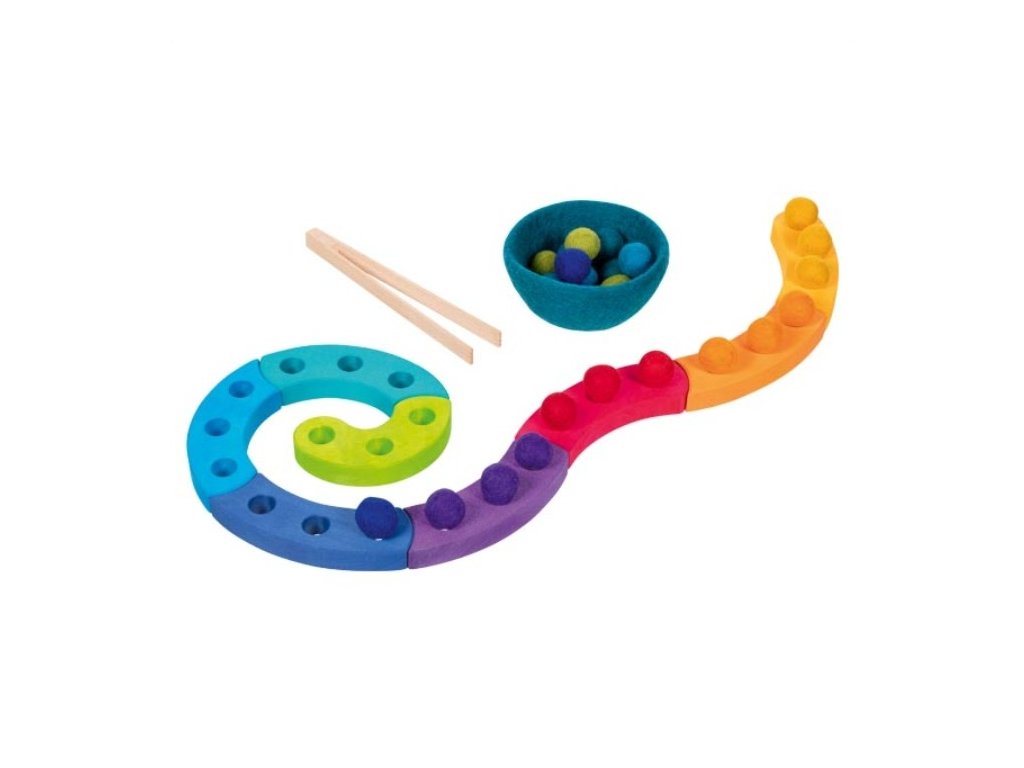 Táto osemdielna špirála vyrobená z kvalitného javorového dreva sa dá použiť rôznymi spôsobmi. Napríklad tvorí klasickú hru na triedenie farieb, ktorá deťom umožňuje hravo objavovať svet farieb a počítania. Zdvíhanie a triedenie vlnených plstených guľôčok do zodpovedajúcich priehradiek pomocou klieští z bukového dreva podporuje koncentráciu a rozvíja koordináciu ruka-oko.