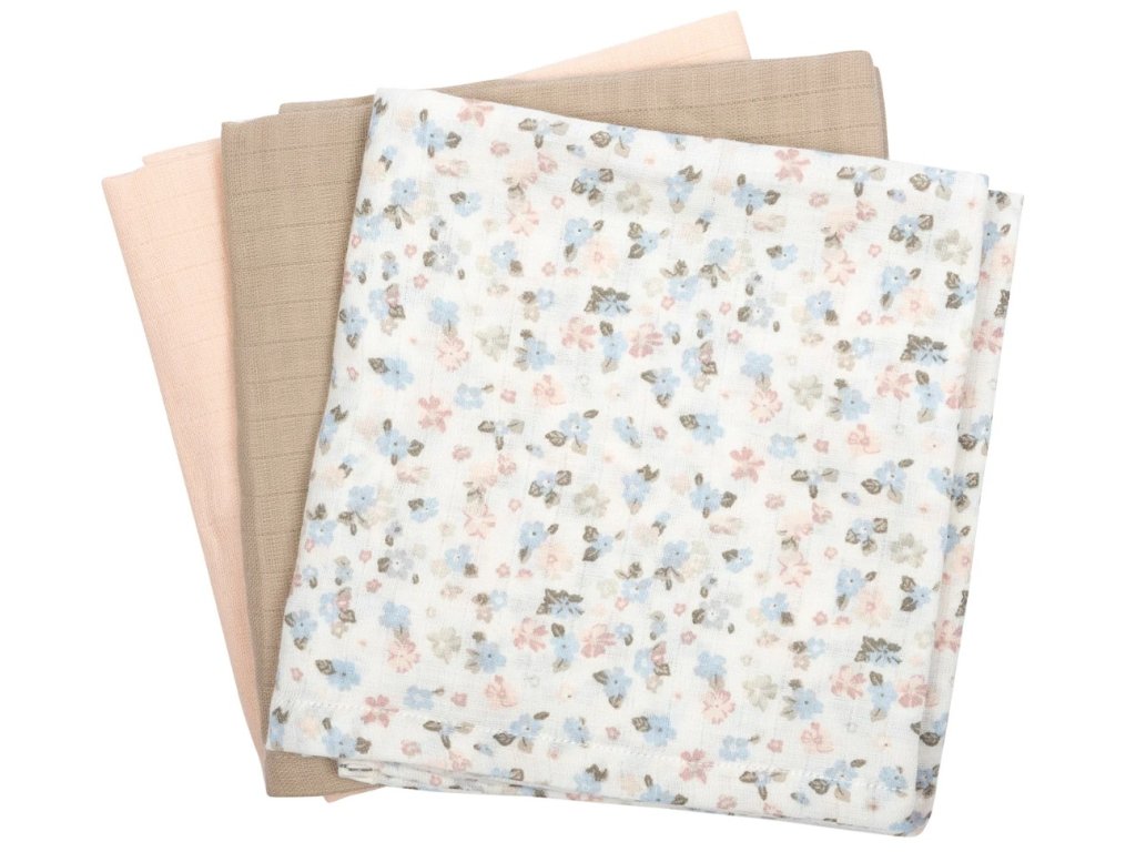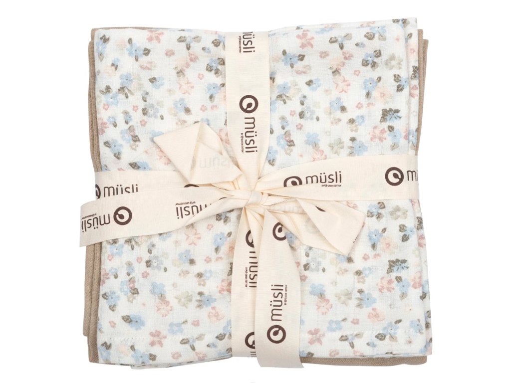Troj-balenie mušelínových plienok zo 100% bio bavlny v jemnej béžovej, ružovej a kvetovanej farbe od Müsli. GOTS certifikované.